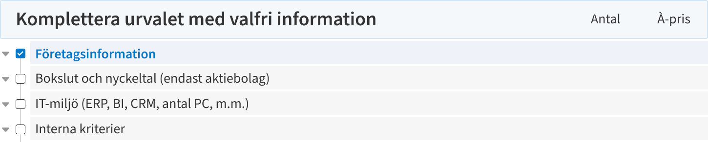 Företagsnamn och utdelningsadress ingår alltid som standard. Du kan enkelt komplettera ditt företagsregister med namn på beslutsfattare, e-postadresser, direkttelefonnummer och mycket mer.