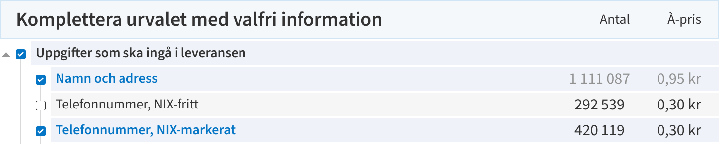 Namn och utdelningsadress ingår alltid som standard. Du kan välja att komplettera dina adresser till privatpersoner med till exempel fasta telefonnummer eller mobiltelefonnummer i din leverans.